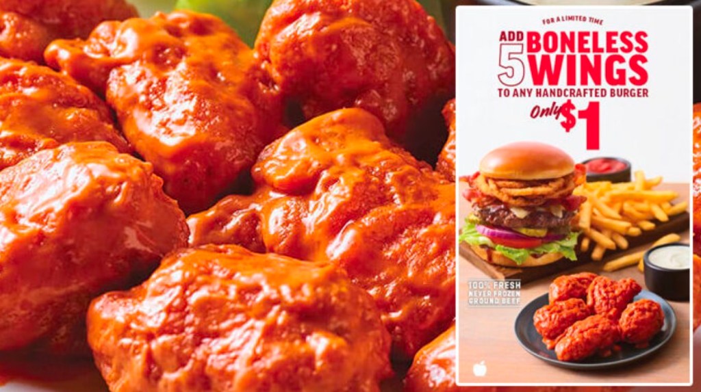 Additionally, you can swap an Impossible Burger patty in any of the brand’s Handcrafted Burgers for an upcharge of $1.99 and add a side of five boneless wings for $1.