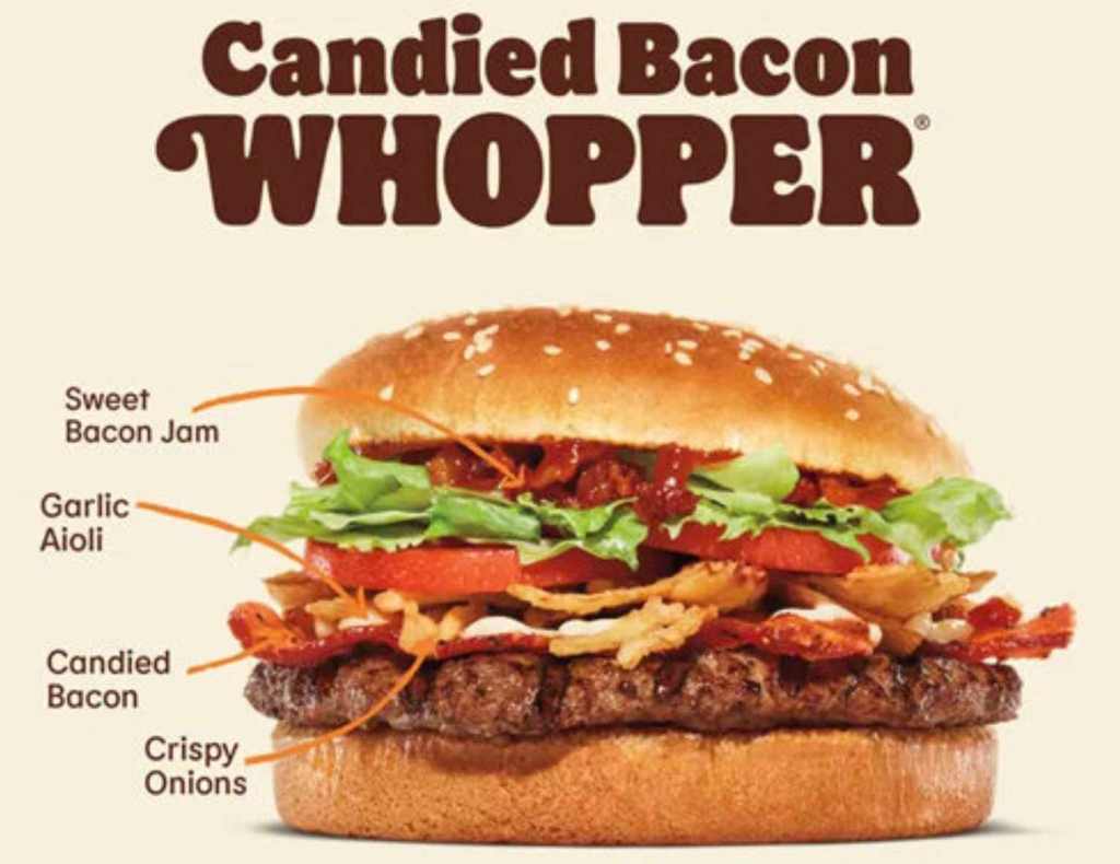 The Candied Bacon Whopper item features sweet bacon jam, garlic aioli, candied bacon and crispy onions — alongside a half-pound beef patty, lettuce and tomato — all sandwiched between BK’s classic seeded bun.